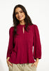 Enkel og elegant bluse fra IN FRONT. Stoffet er med stribet struktur, blusen har 3/4 lange ærmer, der afsluttes med manchet. V-halsudskæring, der kan lukkes til med en enkelt rhinsten-knap og lille påsyet flæsekant i halsen.
