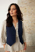 Flot klassisk vest fra INFRONT. Sort figursyet vest med knaplukning, og paspolerede lommer og foer. Vesten har en længde, der gør den egnet over både skjorter og kjoler, til nederdele og bukser.