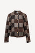 En elegant og stilfuld kort jakke fra IN FRONT med et patchwork-ternet design. Den er designet med en elegant kinakrave og en gennemgående knaplukning med guldfarvede knapper.